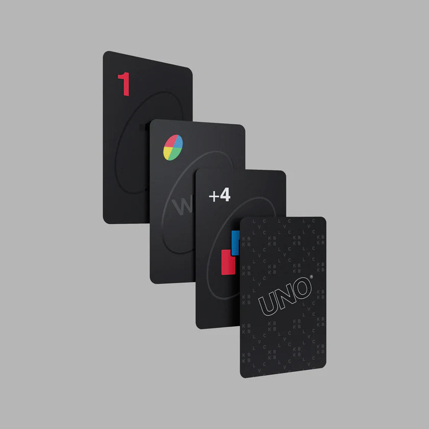 Transform your card games with the fresh 'Blvck x UNO' playing cards - they'll add a stylish pop to your usual setup. Each card is meticulously crafted, featuring UNO’s classic vibrant hues set against the timeless elegance of black. The cards are punctuated by the monochromatic UNO logo on the back and encased within Blvck Paris’ iconic monogram pattern. Overall, the logos and symbols are notably streamlined, resulting in a more minimalistic appearance. This exquisite item makes for the perfect gift, elevating family and friends' game nights or enhancing your prized card collection. An exceptional and exclusive addition to any collection. What's in the box: - Includes two decks of double-sided cards and instructions - Matte black finish with Glossy Highlights