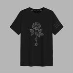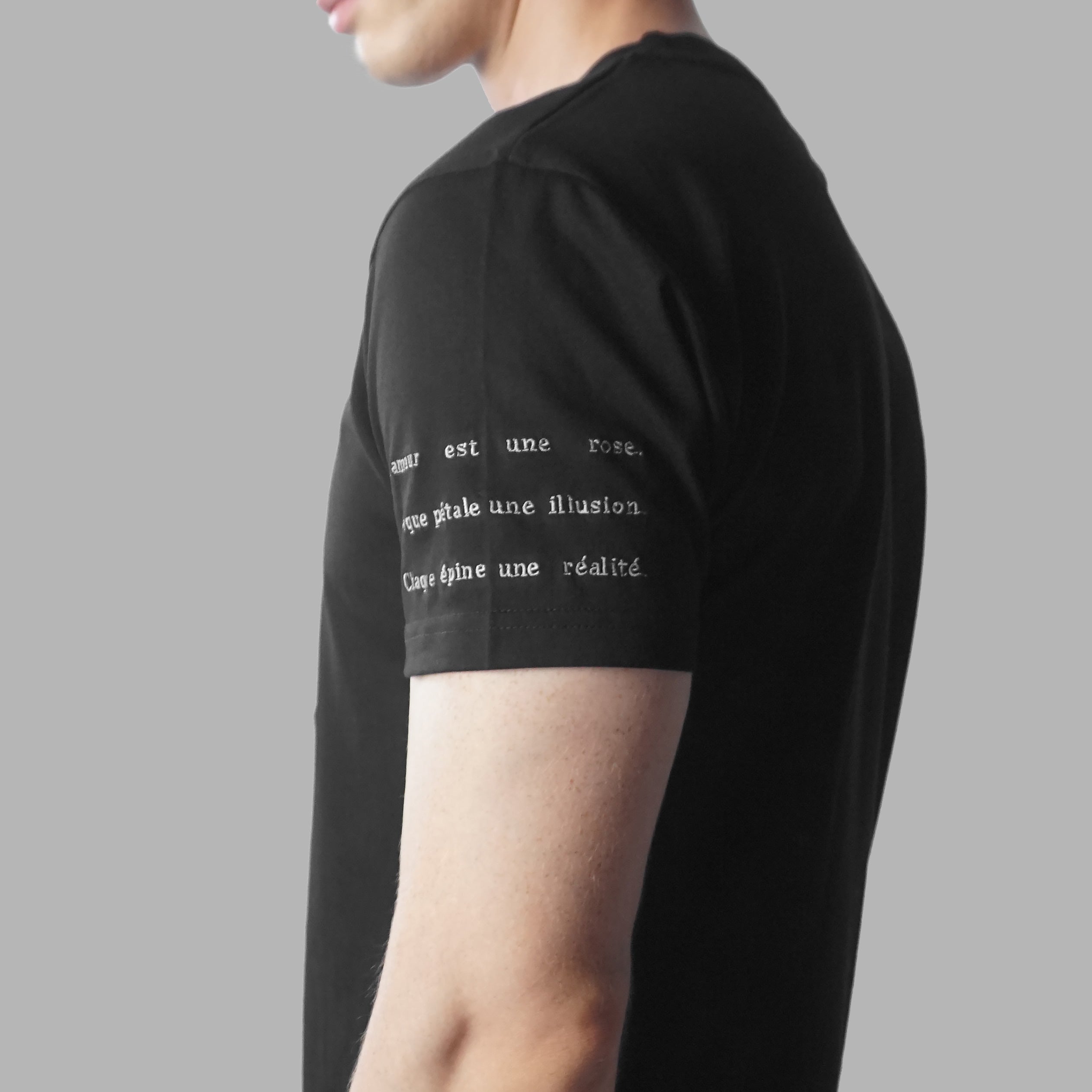 Part of the BLVCK07 Collection, the 'Blvck Rose Eternelle Tee' features our Signature Rose in embroidery with our floral logo. The tee features an abstract in French from poet Charles Baudelaire around the arm.