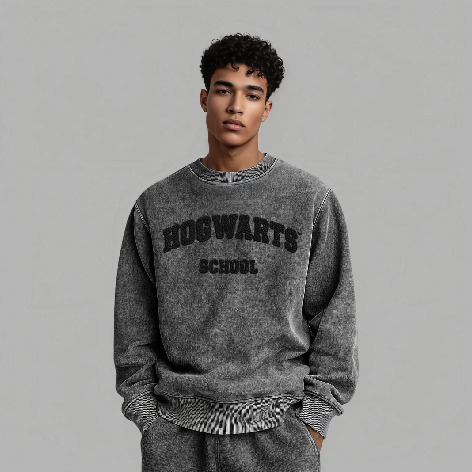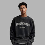 The Hogwarts School Sweater features a bold collegiate-style front graphic in a washed grey print, designed to evoke the spirit of classic university sweatshirts, but with BLVCK’s signature moody minimalism. The garment-dyed vintage black finish gives it a worn-in feel, while the subtle Harry Potter x Blvck rubber patch on the upper back adds a refined final touch.